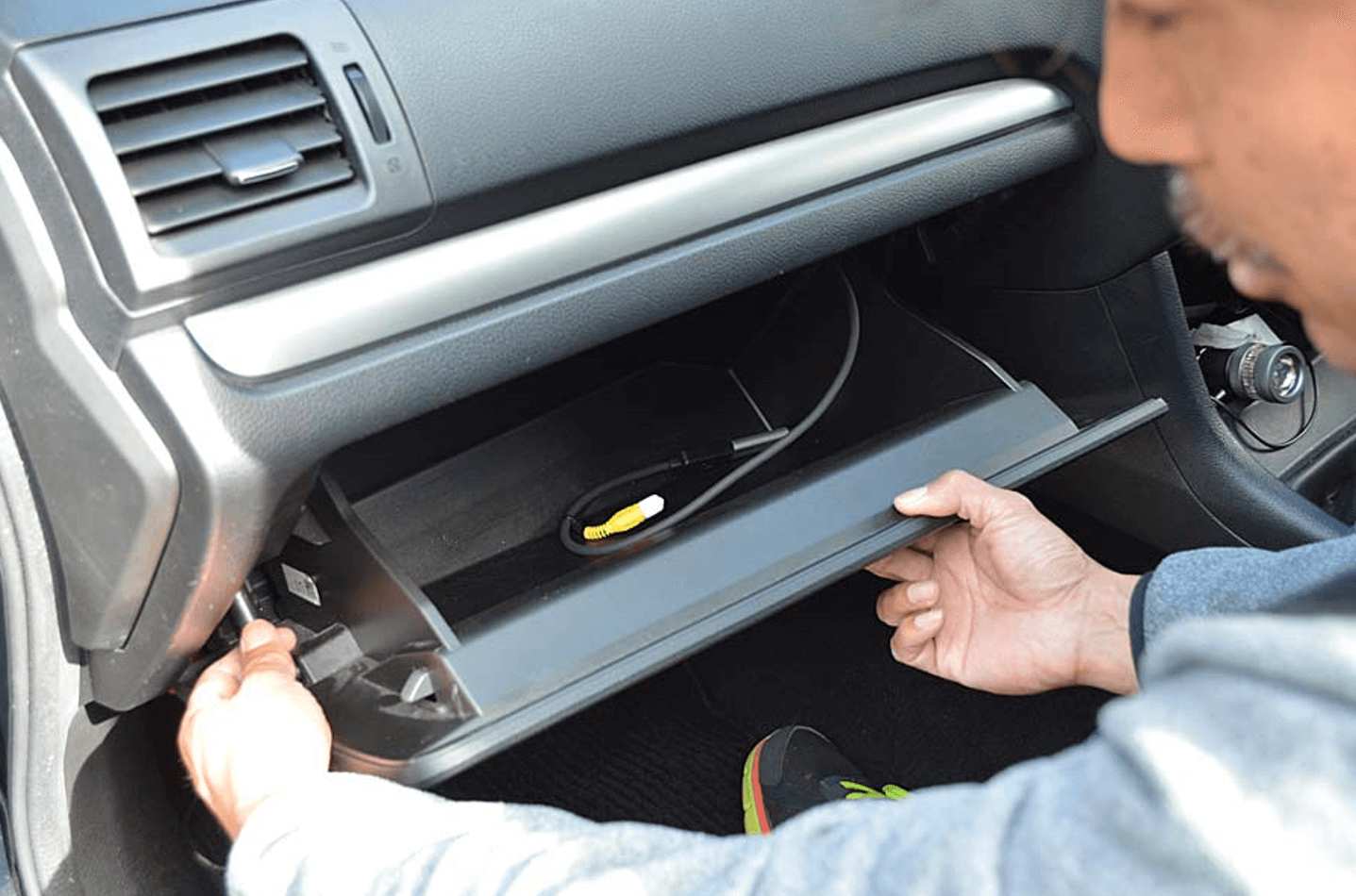 엔진을 끄고 조수석 도어를 열고 글로브 박스를 여십시오. 상자 안에 있는 물건들이 쏟아지지 않도록 꺼냅니다.